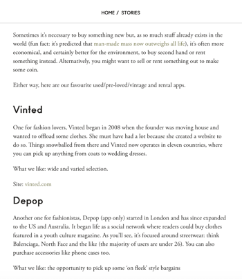 The writing is clear, straightforward, and direct to support the brand’s transparency values. The writer takes the angle of eco-friendliness in the opinions expressed throughout the piece (i.e., “so much stuff already exists in the world”).