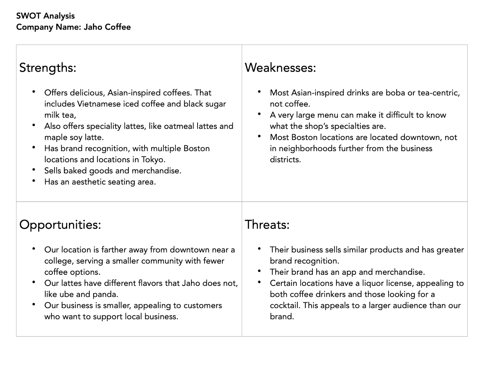 A SWOT analysis can help you better position your brand in your market. For our coffee shop, let’s run a SWOT analysis on Jaho, another Asian-inspired coffee joint in Boston.