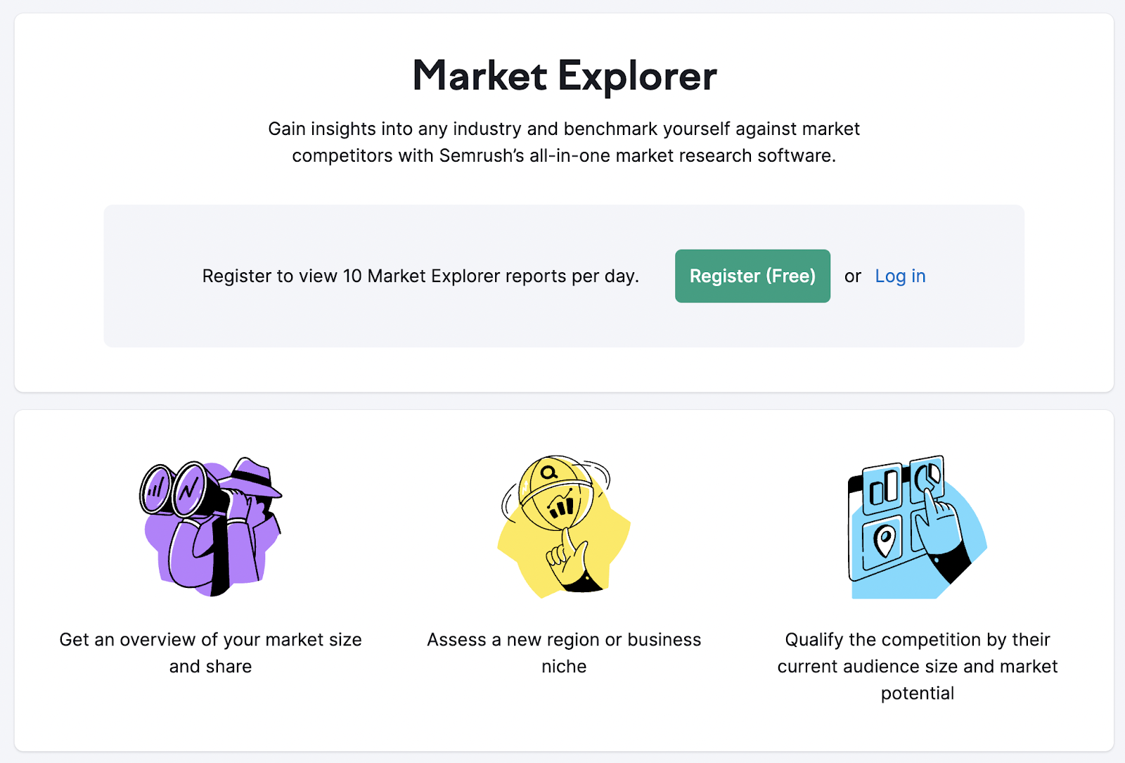 Semrush offers a free trial that includes market research tools. Here you can see the size of your industry, available niches for your business to fill, and your competitors’ market potential.