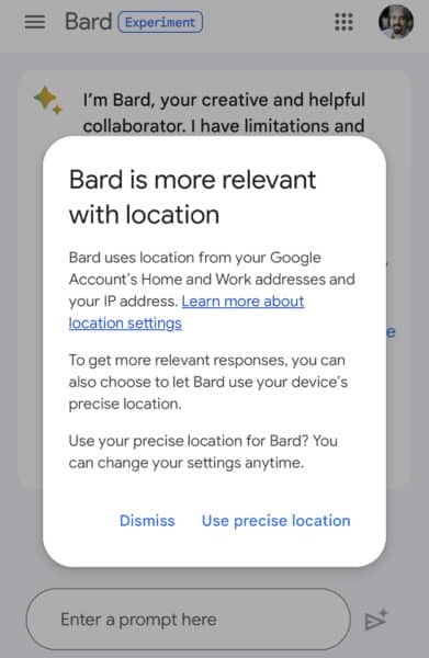 Google Bard can now use your device’s precise location to provide better local results to your questions. When you go to Google Bard, a popup dialog may show up that reads “To get more relevant responses, you can also choose to let Bard use your device’s precise location.”