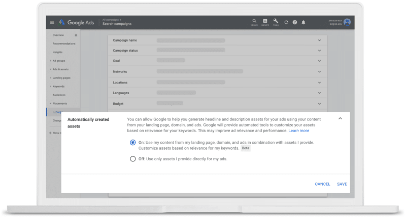 Create new assets with Google’s AI. Google’s goal is to help advertisers deliver effective ads to their target audience by having a variety of relevant creative assets available. To achieve this, they now offer a setting called “automatically created assets” which generates new ad components based on an advertiser’s existing assets and landing page. This setting allows responsive search ads to show potential customers the best combination of assets.