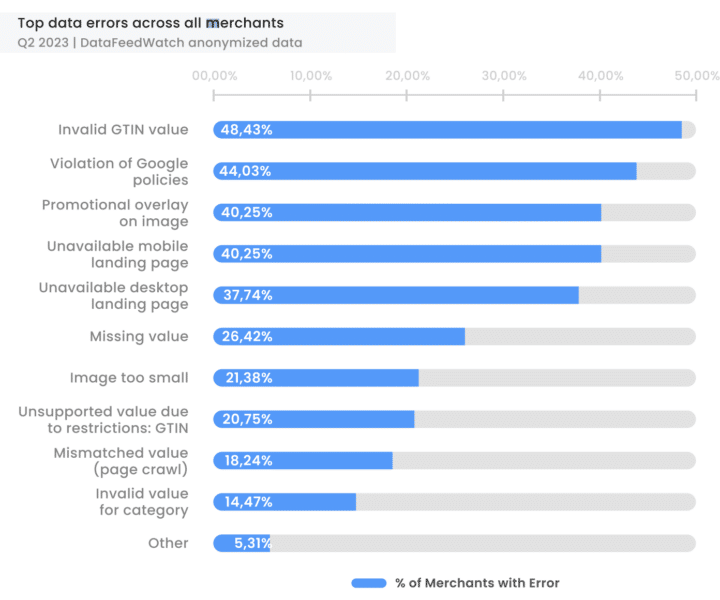 Invalid GTIN errors affect almost half of all merchants (48.43%) and over 4% of submitted products. Google penalizes accounts for wrong GTIN values, so it’s crucial for merchants to fix identification problems to avoid listing rejections.