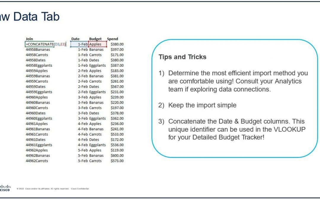 Once you have the data in the workbook, the only manipulation required is the creation of the join, which is simply the unique identifier you will reference to VLOOKUP the data into the detailed budget tracker (more in the next section).