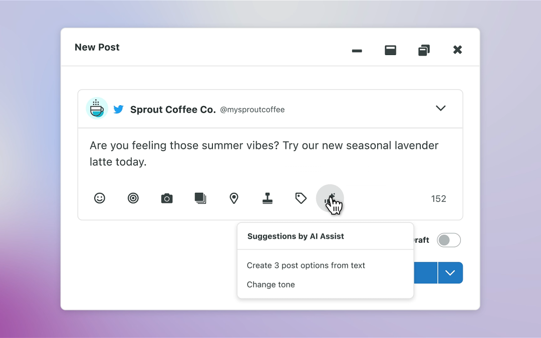 - Social media scheduling. Sprout’s AI and patented ViralPost technology puts brands in a position to streamline workflows. The latest Suggestions by AI Assist features helps you create high-quality captions in seconds, enabling you to break through writer’s block, inspire new ideas and enhance your post copy. What’s best—this feature is available on all Sprout Social plans.