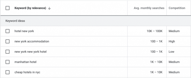 Screenshot of Google Keyword Planner showing competitive keywords for New York hotels