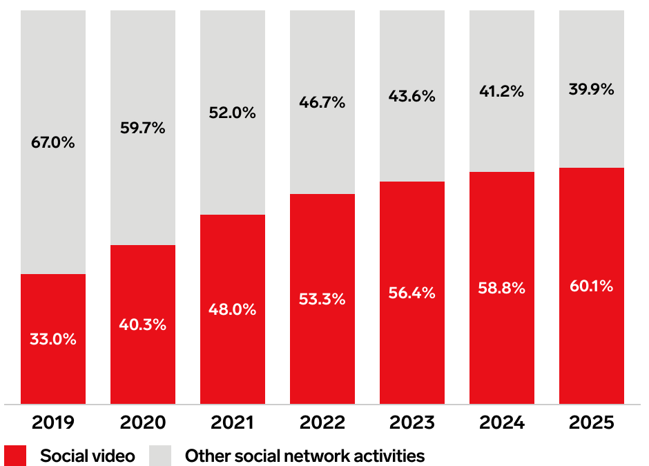 - For US adults, video’s share of the average daily social media time is plateauing.