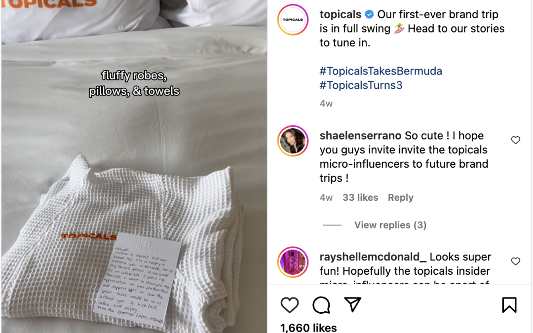Topicals featured influencers on their brand account, but the guests also posted daily content on their Instagram Stories. Recaps were also posted on TikTok. The campaign used the tags #TopicalsTakesBermuda and #TopicalsTurns3 to mark content.