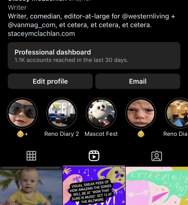 Off to an easy start! To boost a Reel, you first have to pull up the Reel that you want to boost… which means heading to your Instagram profile to take a look at all of your previously published Reels.