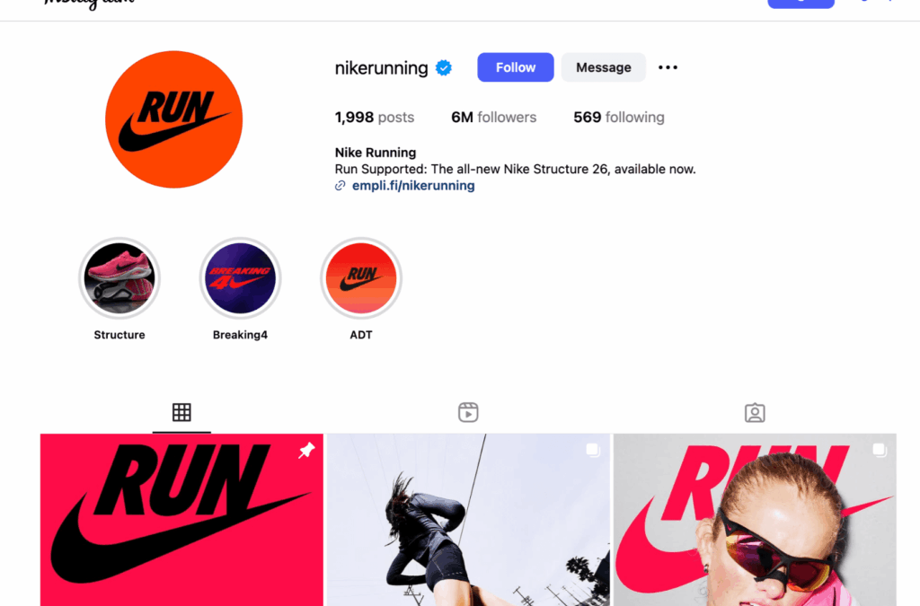 Nike also embraces niche communities, creating segmented accounts for sub-brands, sports, regions and specific demographics (e.g. @nikerunning).