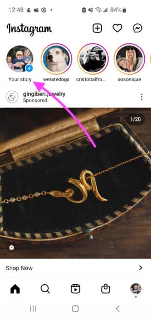 Step 2: Tap on the Your Story icon in the top left corner of the screen or find a post you would like to share and hit the airplane widget then click Add post to your story