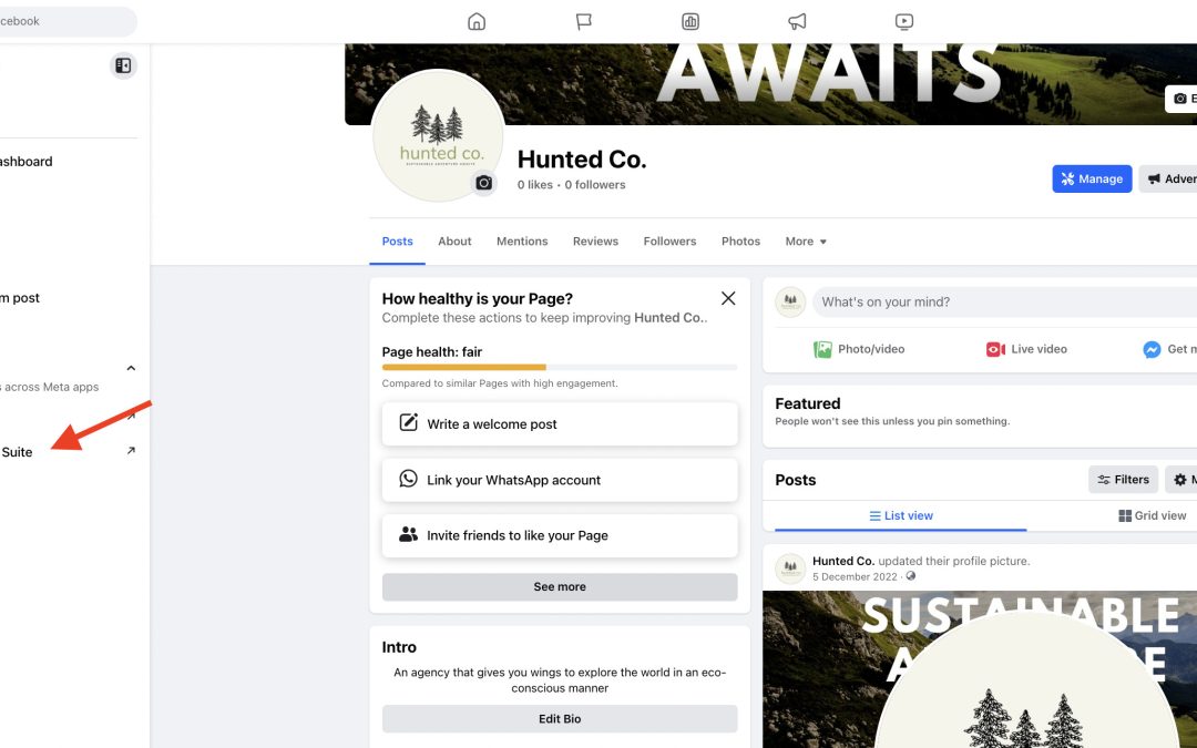 Step 1: Start by logging into your Facebook account. Head to your Facebook Page, then switch profiles so you’re managing your Page. In the left-hand sidebar, click on Meta Business Suite.
