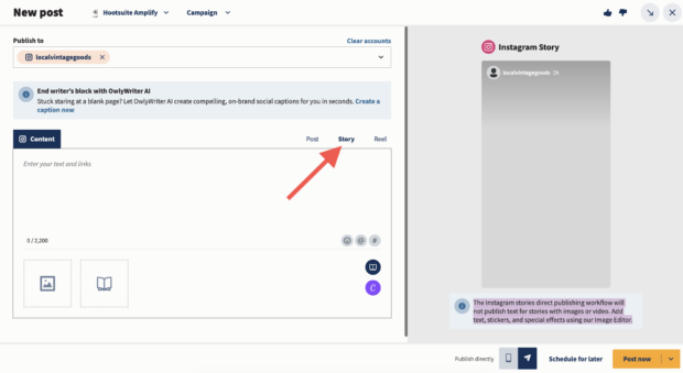 Head to your Hootsuite dashboard and select Create → Post from the left-hand side menu. Then, follow these 4 simple steps to schedule an Instagram Story: