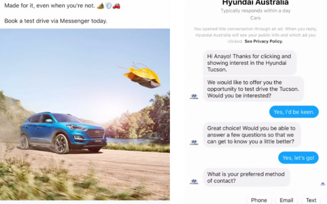 You can also set up Facebook ads targeting potential customers and encourage them to get in touch with you via messages. Hyundai Australia, for example, reduced their cost per lead by 27% by running Messenger ads that prompted users to get in touch for a test drive.