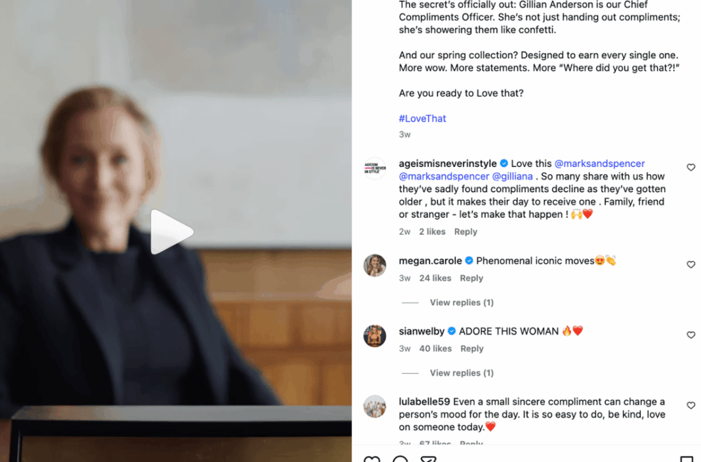 Marks and Spencer pulled at heartstrings when they appointed Gillian Anderson as their “Chief Compliments Officer”, announcing their spring collection campaign #LoveThat. The concept being that M&S’s spring collection is so good it naturally earns compliments. The post elicited adulations from celebrities and fans alike, reacting enthusiastically with comments like “Even a small, sincere compliment can change a person’s mood for the day. It is so easy to do, be kind, love on someone today.”