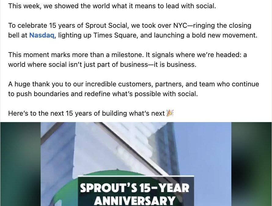 A LinkedIn post from Sprout Social recapping our 15-year anniversary celebration at Nasdaq