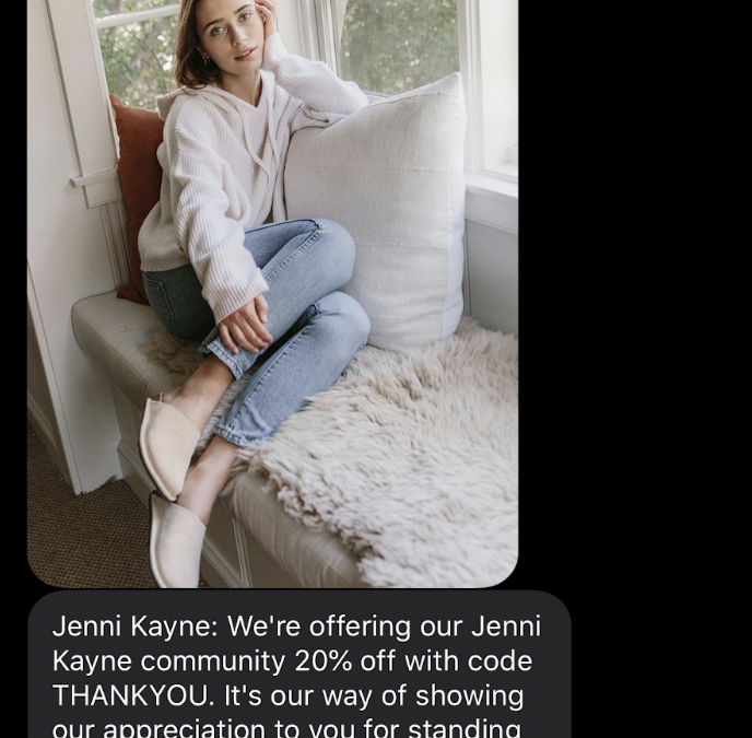 Coupons and promotions can be an excellent way to drive more people to your store or website, especially when accompanied by a quality call to action (CTA). Here’s an SMS marketing example from fashion brand Jenni Kayne, which includes a personalized coupon code and a direct link to their shop page: