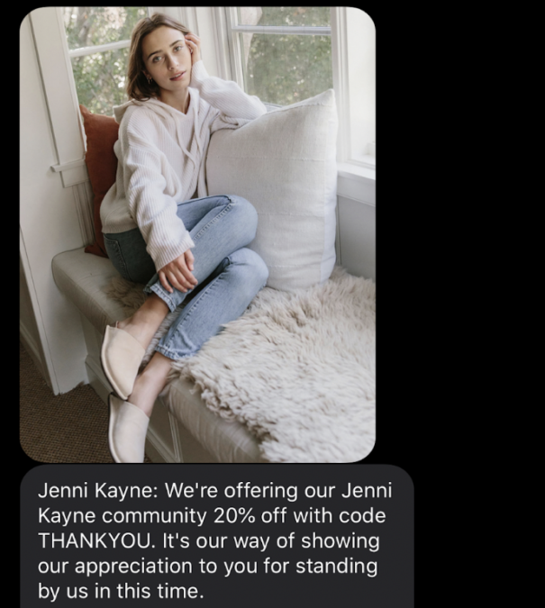 Screenshot of an SMS marketing text from brand Jenni Kayne offering the subscriber 20% off with a code for subscribing to texts.