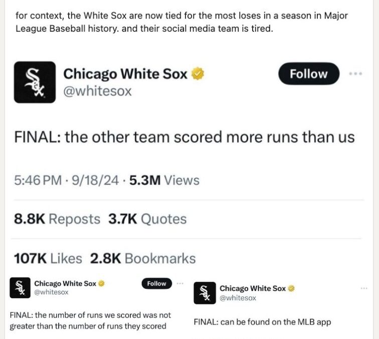 A LinkedIn Post from Social Media Strategist Josh Rangel, declaring his admiration for the Chicago White Sox social media manager. The tweet includes several examples of the White Sox's humorous and self-deprecating tweets about their losing streak.