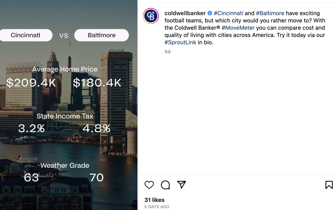 See how Coldwell Banker speaks to football fans in the following Instagram post. The real estate company makes a comparison between two cities with a caption that would resonate with people who follow football.