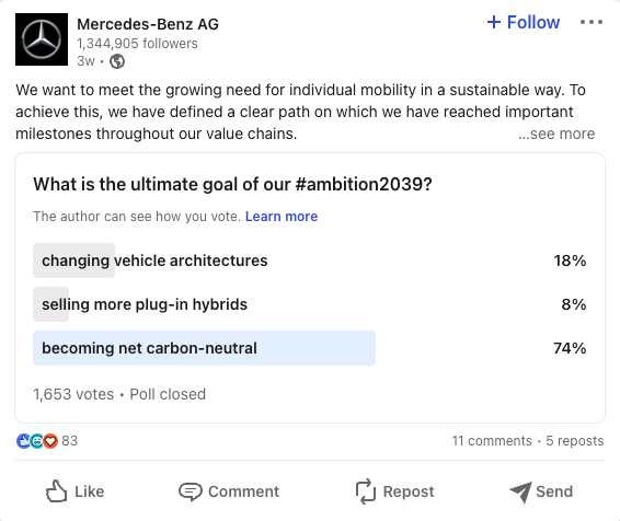 Multi-image posts are a hit on LinkedIn, but this post from Audi gives you more than just static imagery. By breaking the image in two, this post grabs the viewer’s attention and stands out on the feed.