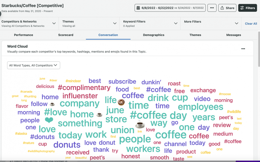 Screenshot of a social listening world cloud in Sprout Social for a Starbuck/Coffee competitive landscape.